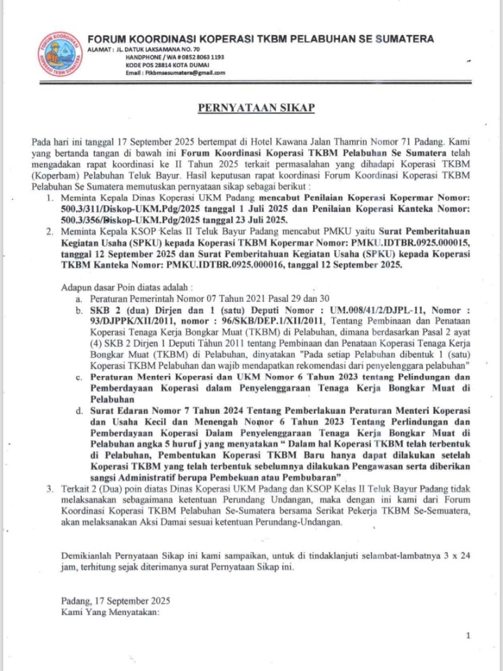 Forum Koordinasi Koperasi TKBM Pelabuhan Se-Sumatera secara resmi meminta Kepala Dinas Koperasi UKM Padang untuk mencabut penilaian terhadap Koperasi Kopermar dan Koperasi Kanteka. Selain itu, mereka juga menuntut Kepala KSOP Kelas II Teluk Bayur Padang untuk mencabut Surat Pemberitahuan Kegiatan Usaha (SPKU) yang telah diberikan kepada koperasi-koperasi baru tersebut.