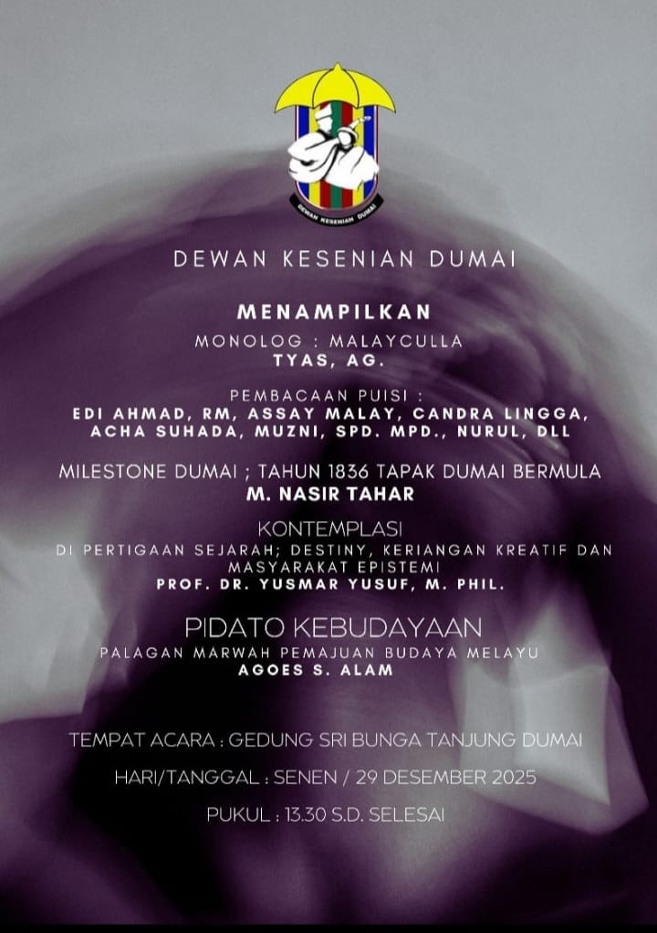 Kegiatan ini menjadi bagian dari refleksi akhir tahun DKD Kota Dumai, sekaligus forum terbuka untuk menyatukan sejarah, seni, dan pemikiran kritis. Melalui pendekatan lintas disiplin [sejarah, sastra, seni pertunjukan, dan filsafat budaya] acara ini diharapkan mampu memperkaya kesadaran kolektif masyarakat tentang jati diri Dumai dan dinamika kebudayaan Melayu di kawasan pesisir.